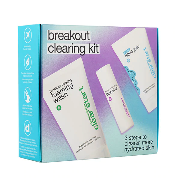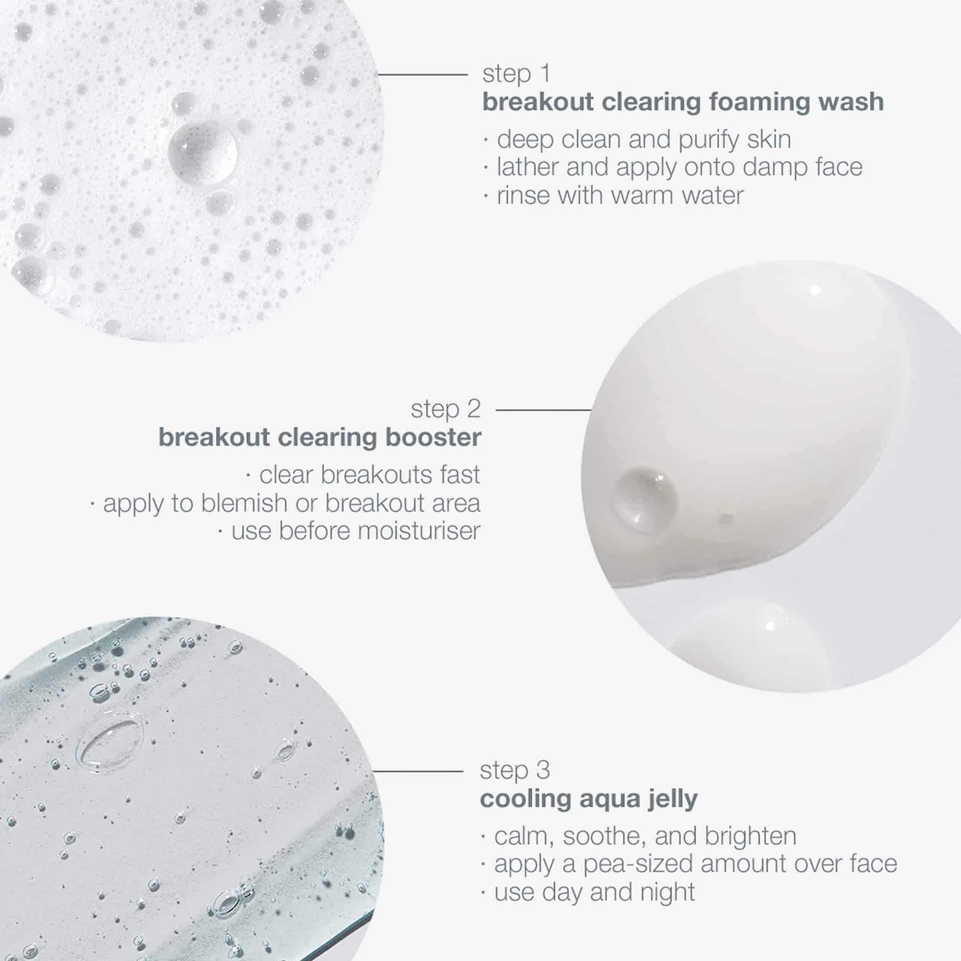 Kit includes: breakout clearing foaming wash 75ml, cooling aqua jelly 25ml, breakout clearing booster 10ml.